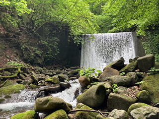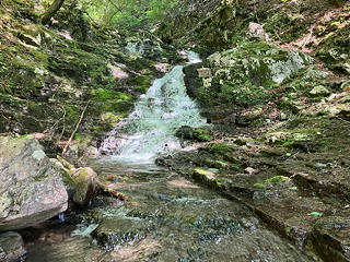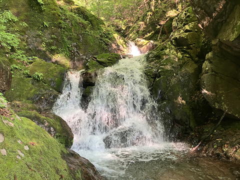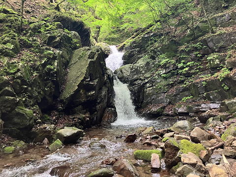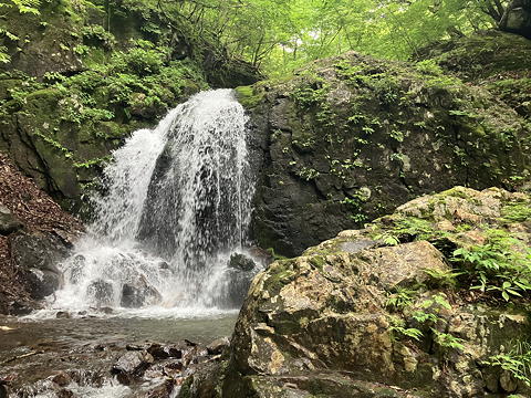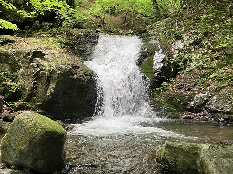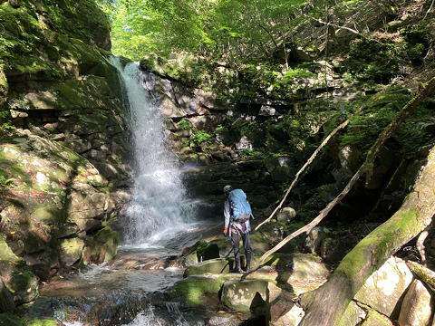 林道終点から歩き始めて1時間半、やっと滝らしい滝が現れました。前日の雨のせいか水量は豊富で直登の可能性は見出せず、左(右岸)から小さく巻き上がりました。
