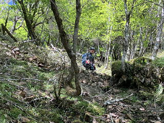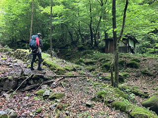 河原に降りてすぐに第2の堰堤が現れましたが、これは左から簡単に乗り越えられます。さらに上流に進むと山道が木橋で沢を横断し、ついで大規模なワサビ田と朽ちた作業小屋が残されていました。こんな具合に遡行を開始してからしばらくはそれなりに興味を引くものが残されていたのですが、このワサビ田の後しばらくの間は、面白みのない歩きを淡々とこなさなければならなくなります。