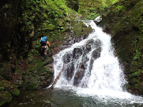 今度はまともに登れる滝が現れました。これは釜の左の壁から滝に近づいて、顕著に見えている右上ランペを辿って落ち口へ抜けることになります。登ること自体は容易ですが、岩がぬめっているために慎重さは必要です。