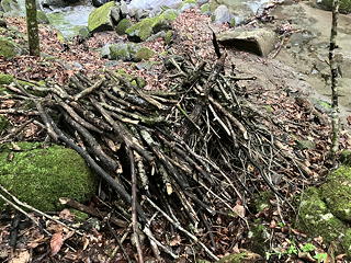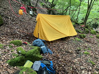 7m滝のすぐ上(標高1390m)は二俣になっており、その左岸にツェルトを張るには格好の広場がありました。計画では12m滝の上まで進む予定でしたし、時刻はまだ14時前とあまりにも早いのですが、どうせ明日の行程も短いので(早く飲み始めたいという気持ちがあったことも否めません)この日の行動はここで打ち切ることにし、リュックサックをおいてツェルトを張ったらせっせと薪集めに精を出しました。
