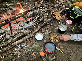 山ほど集められた薪はどれもひどく湿っており、いつもはバーナーでの着火を潔しとしない私も今回ばかりは文明の利器の世話になることをためらいませんでした。おかげで無事に火を熾すことができ、乾杯の後は各自持参した料理を振る舞いあったり、ククリラムをkusutto氏に賞味してもらったり。そうこうするうちにさすがに暗くなってきて、19時すぎには就寝しました。