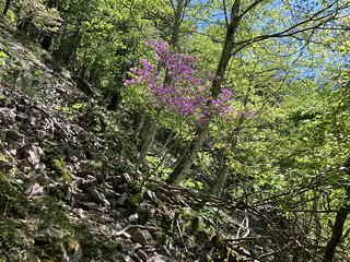 12m滝の上には大規模な幕営適地があり、そこから先はまた淡々とした歩きが続きます。それでも奥の二俣を右に入ると、ムードのある連瀑が現れたり山道[1]が横断したり、ついでにツツジも咲いていたりして、それらに目を向けながら遡行を続けるうちに高度をどんどん稼げてしまいます。