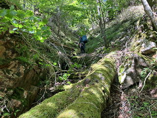 続いて高さのある2段滝が出てきました。これも直登ははなから考えず、右か?左か?と見比べて左をチョイス。やはりちょうど滝の落ち口の上にトラバースすることができます。
