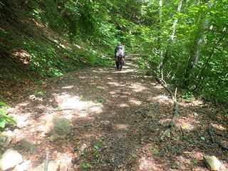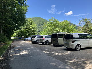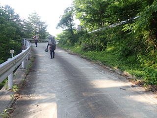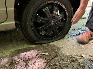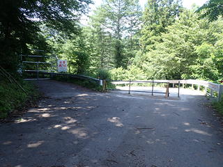 沼田から赤城山の北麓を横切る片品川(利根川の支流)沿いの道に入り、やがて幹線を離れて栗原川林道に入ったのですが、路面に散乱している鋭利な落石のために目的地から3kmの場所でタイヤがパンクするアクシデント。えらいこっちゃと慌てたものの、kusutto氏が手際よくタイヤを交換して走行を継続でき、どうにか山行の起点となるゲート前の駐車スペースに到着できました。