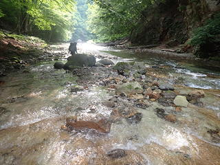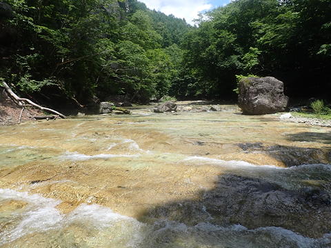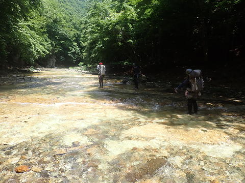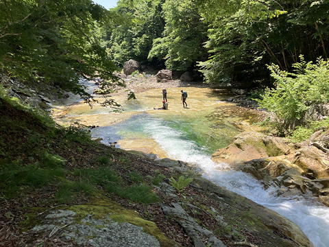 15分ほどの下りで栗原川に入渓。穏やかな河原を歩くとすぐに黄色いナメが広がり始め、歓声が上がります。水量が多すぎるとこのナメ歩きを楽しむことができなくなるようですが、幸い前日が終日晴れだったので、この水量は「適量」と言えそうです。