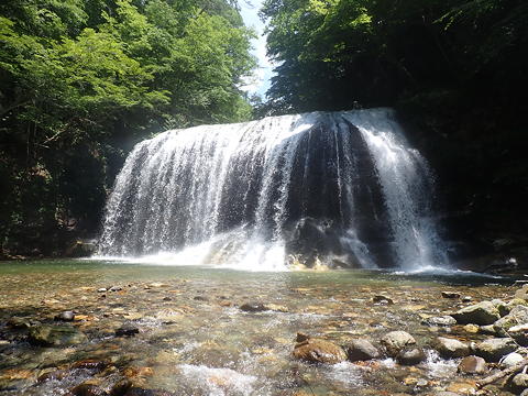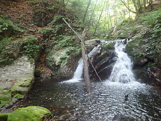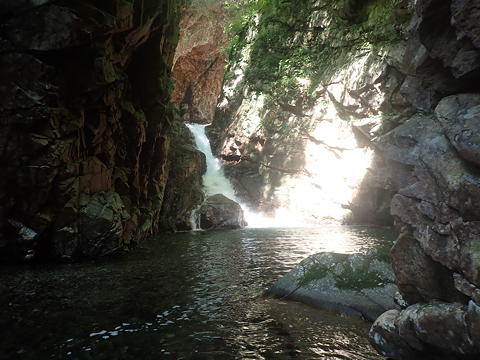とし、その奥に二つ滝が連続していると記していますが、この滝を登った遡行者の記録を読む限り大膳ノ滝は3段滝と認識されていて、これはその1段目と見るのが一般的であるようです。この手前から左上に上がれば2段目・3段目を視界に納めることもできたかもしれませんが、私以外のメンバーは円覚址への登り口で待っているので、1段目だけで満足して戻りました。