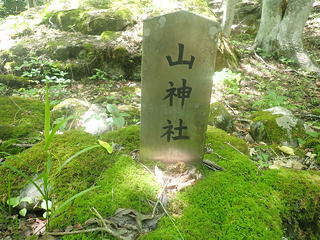 右岸に石垣を見てさらに進み、地形図上でも顕著にわかる右岸の平地に上がってみると、そこが源公平でした。最初は草むらの中に石組みらしきものの痕跡や古いビールの瓶が見られる程度でしたが、上流側に歩いていくと石垣が立派になり、その最も状態のよい石垣が残っている場所には山神社があったことを示す金属の記念碑が立っていました。