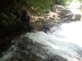そうした中で例外的に大きさがある10m滝は左壁が階段状になっていますが、ヌメりがあるために慎重を期してkusutto氏にロープを引いてもらいました。すいすいと滝の上に出たkusutto氏はハーケン2枚で確保支点を作り、中間の二人はタイブロック登攀、ラストは普通に引き上げです。