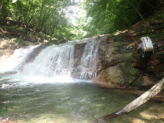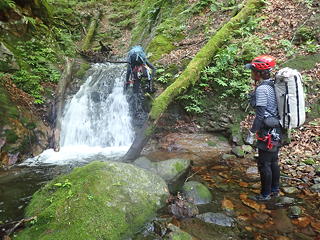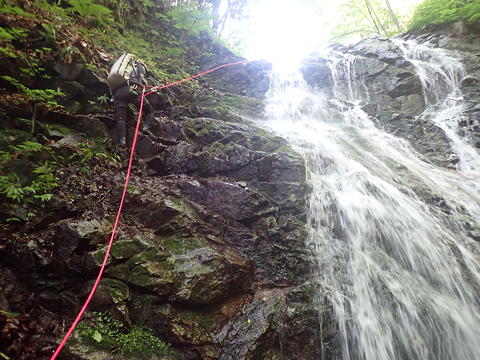 大滝の手前に2条の小滝が懸かり、右岸側を少し上がった地点にあるトラロープをたどると右岸ルンゼに突き当たるので、その手前から立ち木を支点に懸垂30mでルンゼ下部に下る。