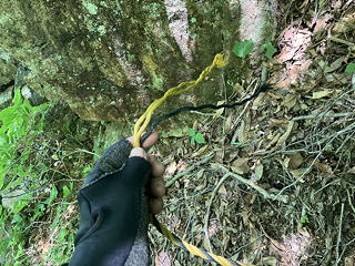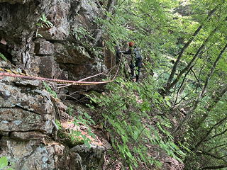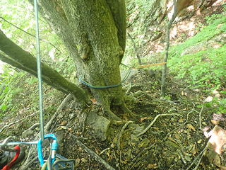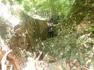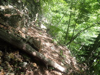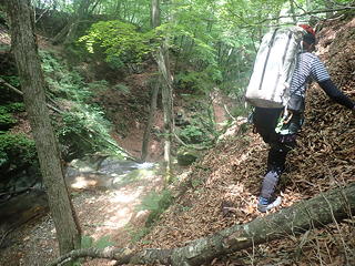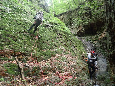 これを「小滝を下ってから右岸側を少し上がる」と読んでしまうと行き先を見失うことになるのですが、正解は「小滝を降りずにそのまま右岸側の斜面を登る」で、そこにはザレたトラバース道にトラロープがフィックスされていました。とは言えトラロープだけでは心許ないので自前のロープを出し、円覚址手前の外傾バンドのトラバースと同様の手順でトラバースにかかりました。この道はザレ斜面の上を20mほど進んで岩が露出した角を回り込み、さらにはっきりしたバンドの上を進むのですが、角のところでトラロープが切れているために一瞬悩みます。しかし回り込んでみるとすぐにトラロープが復活し、トポの記述通りにルンゼにぶつかってその手前のしっかりした木の幹に回された残置スリングを使って懸垂下降するようになっていました。それにしても40m滝を下るのに30mロープ2本で足りるというのはどういうことかと不思議だったのですが、見れば納得、20mほど懸垂下降すると緩い傾斜でなだれ落ちているルンゼの中程に降りられ、そこからルンゼ右岸の踏み跡へ逃げることができますし、30mの長さをフルに使えば右岸の木にセルフビレイをとるところまで確保された状態を維持することもできるというわけです。