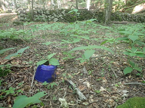 そこには、栗原川から大膳ノ滝と円覚ノ滝の高さの分だけ上がった中腹に広がる台地のあちこちに石垣が残されていますが、源公平が川沿いの平地で明るく開けた場所だったのに対し、こちらは木々に囲まれつつ地形をうまく利用した平面プランになっていて、どこか山城っぽい雰囲気が漂います。そして、こうした場所の常としてあれこれの落とし物がここにも残されていましたが、栗原川林道が通行可能だったときには釣り師が車でこの上までやってきて山道を下り円覚から上流へ行くことができたそうですから、遺物が必ずしも林業集落時代のものとは限りません。それでも時間があればあちこちを見て回りたいところですが、すでにこの時点で16時であるため、ここも先を急ぐしかありませんでした。
