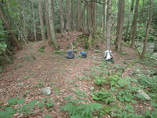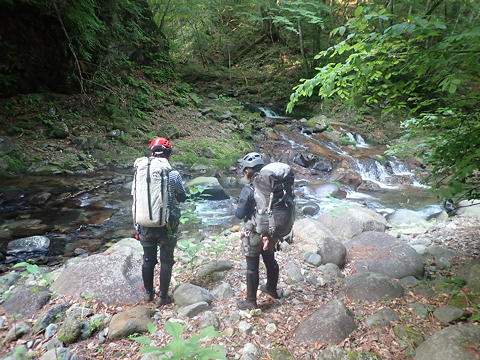 降り着いたところは東へ伸びる栗原川本流と南へ分かれるツバメ沢との二俣で、その周辺にはトポに書かれているとおり幕営適地が広がっていましたが、幕営の痕跡は見当たりませんでした。