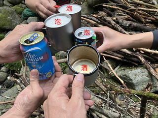 先行パーティーは不動沢と栗原川本流とを分ける尾根の1105標高点から北に伸びる尾根の末端のわずかに高いところに絶好のテン場を見つけて盛んに煙を上げていましたが、その平地の沢側には石垣が組まれていたので、これはおそらく径路跡。いいところを見つけたなあと羨ましく思いながら先に進み、ようやくメンバーの全員が納得できる平坦地が見つかったときには16時40分になっていました。そこから急いでテントやツェルトを設営し、皆で薪をかき集め、そしてやっと乾杯です。今日一日、お疲れさまでした。