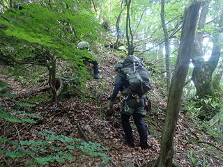 昨夜幕営した場所は1105標高点の東の鞍部のわずかに手前で東北へ張り出している小尾根の対岸でしたが、本来のルートはこの小尾根の下流側から斜面に取り付き、斜上して鞍部に達するものです。しかし我々はその取付きポイントを過ぎていたので小尾根の末端から直登するラインをとったのですが、するとやはり下流方向から明瞭な径路が上がってきていて、これを使って鞍部に達したところ、径路はさらにこの尾根の南側(栗原川本流側)をトラバースして栗原川上流を目指していました。つまり、この径路は円覚ノ滝の落ち口上で吊り橋を渡った道の延長線上(行き先は砥沢)だということです。