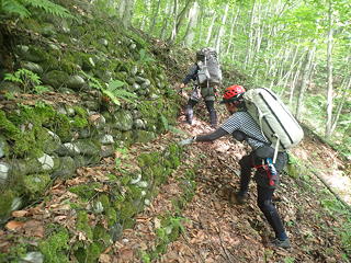 40m大滝を巻き終えるとまたしても林業の痕跡が現れます。最初に左岸に出てくる堰堤のように立派な石組みはトポにはワサビ田跡