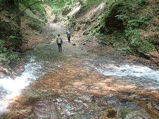 ケヤキ沢の下降にはこうした昔の仕事道の跡が作る右岸の平坦な地形を利用することができて助かるのですが、ふと見ると左下を流れるケヤキ沢は深くえぐれたゴルジュ状になっていました。そして右岸の平坦な地形がえぐれて行き詰まったときにケヤキ沢の中へ下らなければならなくなったのですが、幸いにもそこはゴルジュの終点に近い場所で、おかげでゴルジュ内に閉じ込められることなく下降を続けることができました。