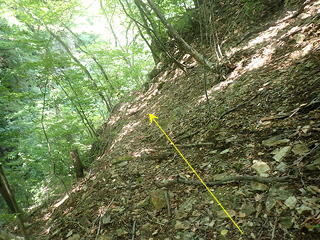 円覚址へはもともと源公平から道が通じていたはずで、周囲の地形から考えるとその道はやはりこの位置から急登していたと考えられますが、派手なガレの押し出しが斜面を埋めていてそれらしい痕跡は微塵も残っていません。我々はまずは右岸に切れ込んでいる小沢を忠実に辿ることとし、出だしの段差を越えて谷筋の奥に進んだのですが、すぐに行く手に越えられそうにない6m滝が現れたため、左の小尾根へ逃げることになりました。斜度が強く足元が崩れやすいこの小尾根を慎重に登ると、先ほどの6m滝からずいぶん上がった頃に右に外傾バンドが続いていることに気づいたので、ロープで確保してもらってこのバンドを渡り、木の幹にスリングを巻いてロープをフィックスして女性2人はヴィア・フェラータの要領で後続してもらい、最後にkusutto氏を迎え入れました。少々嫌らしいトラバースだったので「これはルートを誤ったかな」と思ったのですが、ロープをフィックスした場所から谷の向きに沿って左に回り込んでみると明らかにそこは道になっており、トポに書かれているように滝上に懸垂