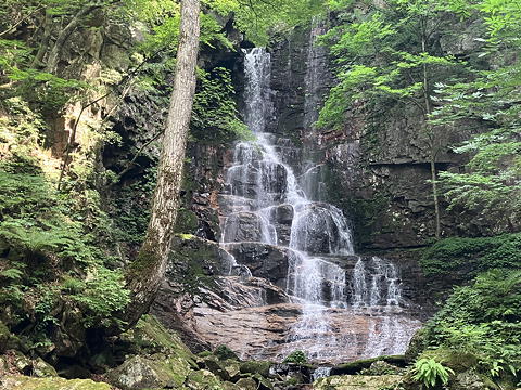 こうして全員が無事に40m大滝を巻き終え、沢の底に降り着いて振り返ると、この大滝は実に立派です。裾に綺麗なナメの斜面を持ち、中段は立体的な岩の積み重なりの中に幾条にも水流が分かれ、そして上段は狭い落ち口から垂壁に沿って一気に水を叩き落としていて、どこに出しても恥ずかしくない風格を備えており、しばらく見入ってしまいました。