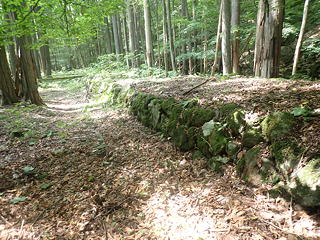 と書いてありますが、これは明らかに物流のための径路跡です。さらに下流へ進むと右岸に広がる台地の中に、幅3mほどの石垣が延々と下流方向へ続いていました。源公平の出張所による伐採事業は時代が下るにつれてその範囲を広げ、ケヤキ沢流域まで及んでいたということですから、これはこの周辺で伐採した材木を載せて源公平に運ぶトロッコの軌道跡に違いありません。そうだとすれば、昨日源公平の手前の右岸に見た石垣はその軌道が川を渡るための橋脚だったかもしれません。