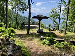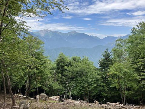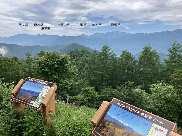 そんな根性のない私には、斜面の途中に設けられていた南アルプスエリア眺望ポイントからの南アルプス(ほぼ)全山の眺めがうれしいご褒美になりました。右の端にはちらっと甲斐駒ヶ岳、ついで白峰三山、白峰南嶺が連なり、悪沢岳・赤石岳・聖岳・上河内岳と主脈南部の山々が続いて、それらの左端には双耳の笊ヶ岳が見えています。櫛形山がこれほど展望に恵まれた山だとは知りませんでした。