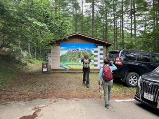 東京都内にいるうちは悪くなかった天気が小仏トンネルを抜けたとたんに一面のガスになり、甲府盆地から櫛形山の麓に達して林道を登るにつれて車のフロントグラスをぽつぽつと叩くものあり。昨日の天気予報ではこうはならないはずだったのに……と思いながら暗い気持ちになったのですが、どうやら雲は櫛形山の中腹にかかっていたものだったようで、池ノ茶屋登山口に着いたところハイキングに支障ない空模様になっていました。