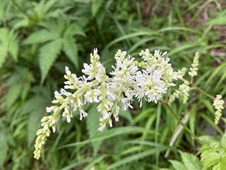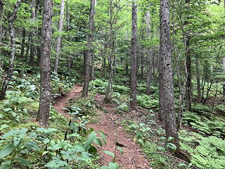 目を転じればバイケイソウの中に登山道が通じていますが、いかにも南アルプス前衛の山らしくサルオガセが垂れ下がっている様子が目を引きます。
