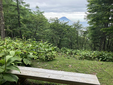 そんなわけでさらに15分ほど歩き続けたところ、今度こそ山頂標識が整備された場所に到着しました。ここで大休止をとることにした我々は、ちょうど富士山のシルエットと向き合える場所に横たわっている木の幹に腰掛けてのんびり行動食を口にしました。