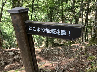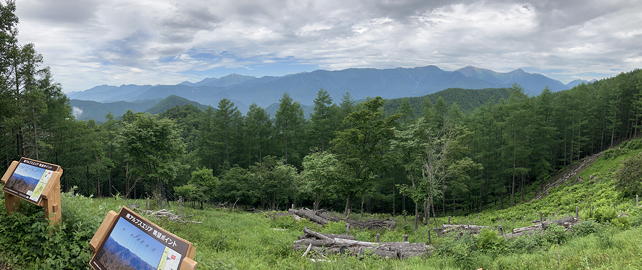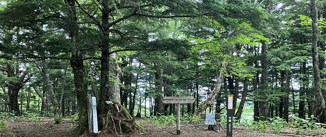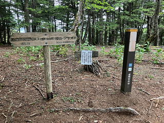 山頂周辺はカラマツ、コメツガ、シラビソなどの原生林になっており、ちょっと暗い印象を受けますが、登山道は土が適度に柔らかく歩きやすいものでした。そう言えばトレイルランナーの姿も見掛けましたが、確かにこの山は標高の高いところを起点にすればアップダウンも少なく、ハイカーの姿が少ない季節と曜日を選べば気持ちよく走れることでしょう。