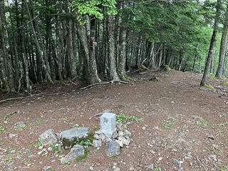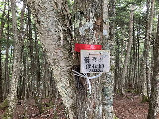 やがて、三角点標柱がぽつんと立っている広場に出ました。ここは地形図に山頂らしく書かれている場所ですが、そこにあった標識には「櫛形山(奥仙重)」という地名表示と共に「山頂は→」とさらに先を指し示す注記が書き加えられていました。