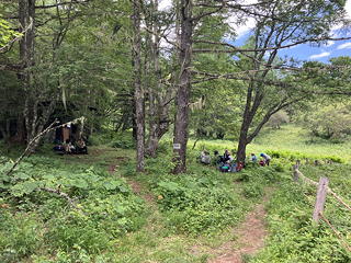 この日の一応の目的地であるアヤメ平は、裸山から20分ほど下ったところにある草原です。予習不足のためにここは高層湿原だと思い込んでいましたが、実際には比較的乾燥した草原になっていて、その中に木道が通じ、一角には休憩舎とベンチが設置されています。