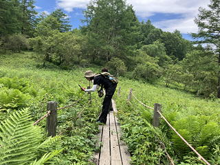 ここでのメグミ先輩のお目当ては、実はアヤメではなくキバナノアツモリソウ(絶滅危惧IA類(CR))で、木道を辿りながら左右の草むらの中を探しています。いず女史と私も及ばずながらこれに加勢したのですが、残念ながら見つけることはできませんでした。