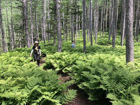 しかし、そうして高度を上げた後に出てきた平坦地に林立するカラマツとその足元を埋め尽くすシダが作る景観には、得も言われぬ不思議な美しさがありました。こうしてみると、ここに達するまでの間に通過したモミジ沢のカエデたちと言い全山に見られるカラマツと言い、この山は紅葉の季節に訪れてもすばらしいに違いありません。