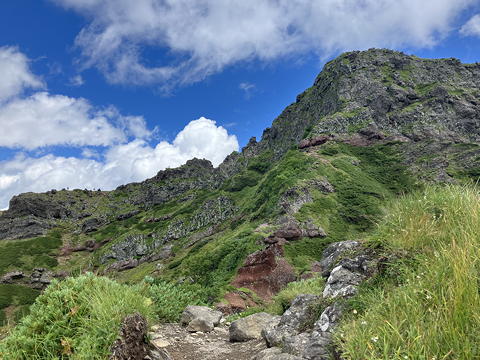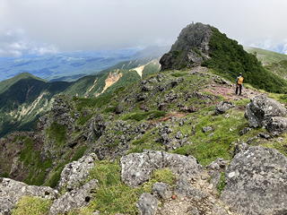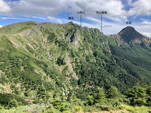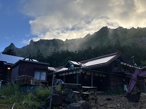 行者小屋に着く頃にはすっかり明るくなっていましたが、都心の猛暑からは想像もつかないほどひんやりした空気の中、稜線付近はガスが薄くかかっている状態です。これでは岩はなかなか乾かないだろうなぁとため息混じりに見上げながら、引き続き中山乗越を目指しました。