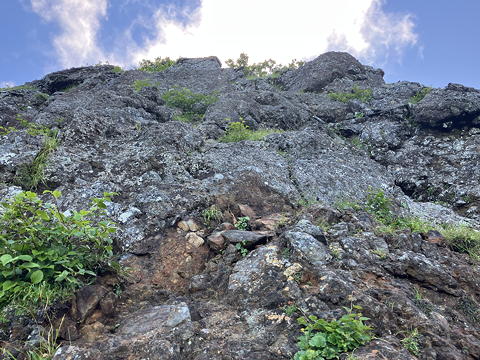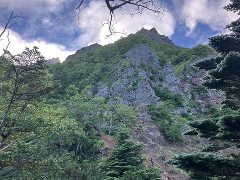 中山乗越で登攀装備を身に着けてから、登山道を離れて尾根をぐいぐいと登ります。毎度のごとく急登に喘ぎながら踏み跡を辿り、やがて目の前に下部岩壁が広がりました。