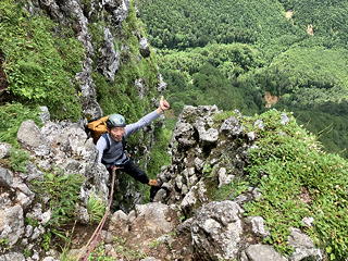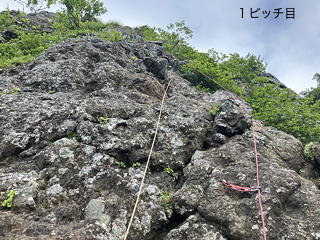 下部岩壁を終えたところでいったんロープを解き、アプローチシューズに履き替えて樹林帯の中を登って上部岩壁へ。この頃になると時折青空が頭上に広がるようになりましたが、まだ晴れたりガスったりの繰り返しです。