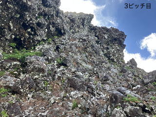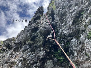 3ピッチ目は再び岩登りになるものの、核心部は越えているのだからと気楽に登っていたら、最後のリッジに出る手前の小ハングに取り付こうとしたところで手にしたソフトボール大のホールドがぽろっと取れてバランスを崩しかけ、冷や汗をかきました。長年にわたりたくさんの登攀者を迎えているはずのこのルートであっても、八ヶ岳特有のぼこぼこホールドは信用しきってはいけないということです。
