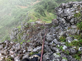 無雪期の中山尾根は昨年8月に登っており、そのときは60mシングルロープだったので下部岩壁は1ピッチで登りましたが、今回はあえて50mダブルとしているので2ピッチに分け、1ピッチ目(III+)をkusutto氏、2ピッチ目(IV)を私という分担にしました。kusutto氏は中山尾根を登るのはこれが初めてながら、危なげなく1ピッチ目をリードして私の2ピッチ目につなげてくれましたが、その間に、ただでさえ岩が濡れている上にガスが下がってきてしまい、おまけに2度にわたってヘリコプターが近づいて我々を見下ろしたのには閉口しました。お仕事ご苦労さまです、しかしコールが聞こえなくなるのであっちへ行ってもらえます?