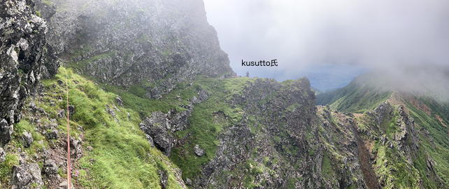 横岳山頂に抜ける最終ピッチ(III-)は私の担当で、後続のkusutto氏を肩絡みで迎えたら登攀終了です。ちょうどkusutto氏を確保しているところへ来合わせた登山者は山頂の端から小同心側を覗き込んで「こんなところを登るんですか?下が見えないじゃないですか。おそろしい〜」という感想を残して足早に去っていきましたが、奥さん、できれば「すごい」「かっこいい」などの褒め言葉がほしかったですね。もっともこのピッチはまったく易しいので、全然すごくはないのですが。