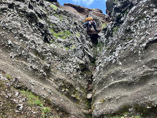 ルート全体の核心部とされる上部岩壁の1ピッチ目(IV+)は私の担当で、脆い小垂壁を慎重に越えてルンゼの中に入り、左の垂壁を丁寧にホールドを拾いながら登って適当な灌木でビレイ。