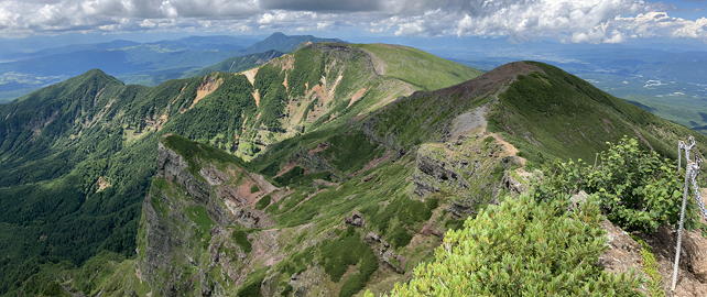 前回はこの後に日ノ岳山頂へ直登しましたが、今回は先を急ぐ身なのでバンドを渡ってあっさり稜線に出て、まずは中山尾根登攀を終了しました。