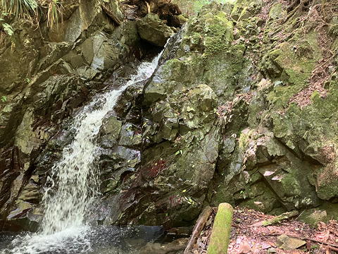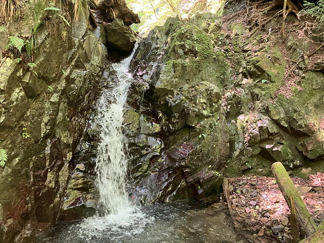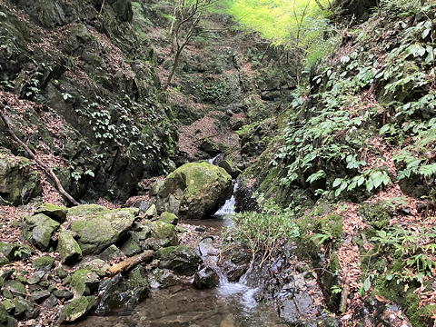続く2段5m滝は沢がヘアピンカーブを描いているところに左から落ちてきており、1段目は右壁に顕著な凹角があるのでここを登ります。2段目は凹角を抜けたところから水流側に回り込んで登ることもできますが、凹角の延長線でまっすぐ登ってしまうのが簡明で、そこで林道との高低差がぐっと減るのでそのまま林道に上がりました。沢はもちろんこの滝の先にも続いていますが、トポによればこの先は水が減りボサも多くなる
