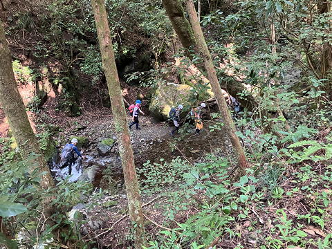 そんな具合にきょろきょろしながら歩いているうちに、ふと左下を見ると沢登りルックの一団が行軍中でした。しまった、入渓点を通り過ぎてしまったかとここから少し引き返すと……。
