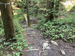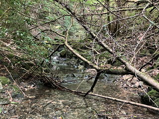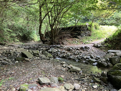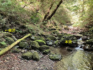 沢に入って50分ほど、最初に見かけた一団を追い抜かしたところで再び木橋が沢を横断する場所に出ました。この右(左岸)にある開けた一帯は小下沢キャンプ場跡で、この木橋から左に登れば景信山、右に登れば北高尾山稜に登ることができます。抜かした一団はここで遡行を終了するようでしたが、自分は引き続き先に進みます。