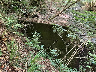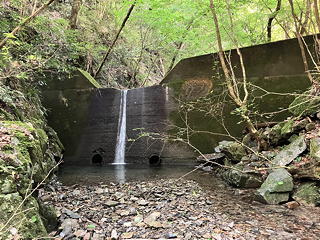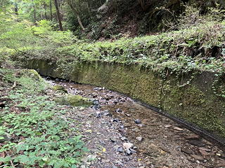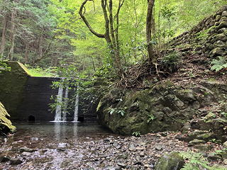 2番目の堰堤は左に踏み跡があったのでそちらから越えられるかと思ったのですが、実際にこれを登ってみたところ堰堤を越えるのは難しそう。仕方なく少し下流に戻って林道に這い上がり、再び林道を少し歩いてから沢に戻りました。