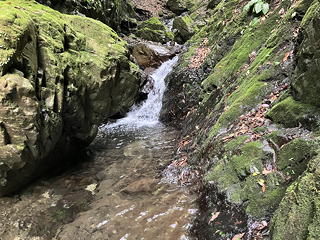 見れば細長い釜を持つ小滝の向こうに、高さは低いもののフットホールドが細かく滑りやすい2条滝があって、ここは慎重に越えました。ただ、このゴルジュ地形が続くかと思いきやそうはならず、すぐにまた面白みのないただの歩き沢(しかも蜘蛛の巣多し)に戻ってしまったために少々落胆してしまいました。