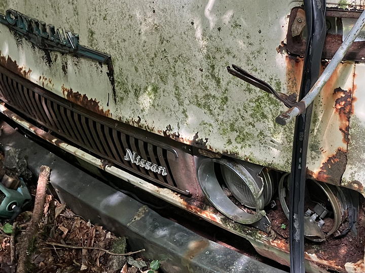 ▲廃棄されていたマイクロバスの「Nissan」ロゴ。(2025/09/09撮影)