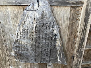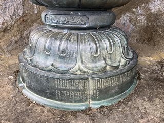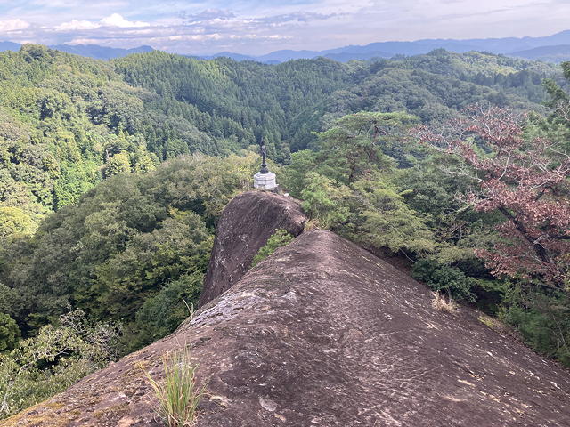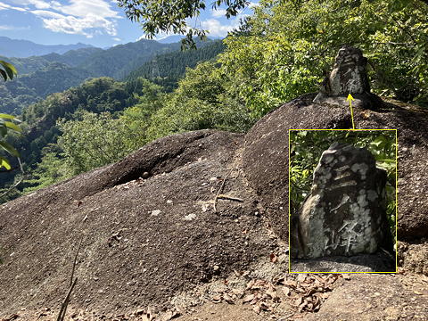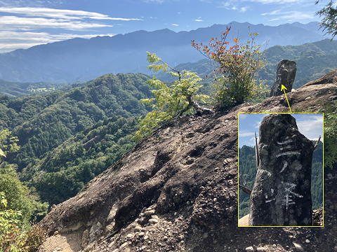 なかなかスリリングなステップと手すりを頼りに登ってみると、これはどうやら岩尾根の突起の前面を彫って仏龕を作ったところに大日如来の銅造坐像を設えたもののようで、智拳印を結び半眼で静かに佇むそのお姿には思わず頭を垂れたくなる威厳がありました。台座には寄進者の名前らしいものがずらりと彫られており、これを見ると「○○兵衛」という名前の多さが歴史を感じさせましたが、後に調べたところ正徳2年(1712)に造立されたものだということがわかりました。