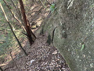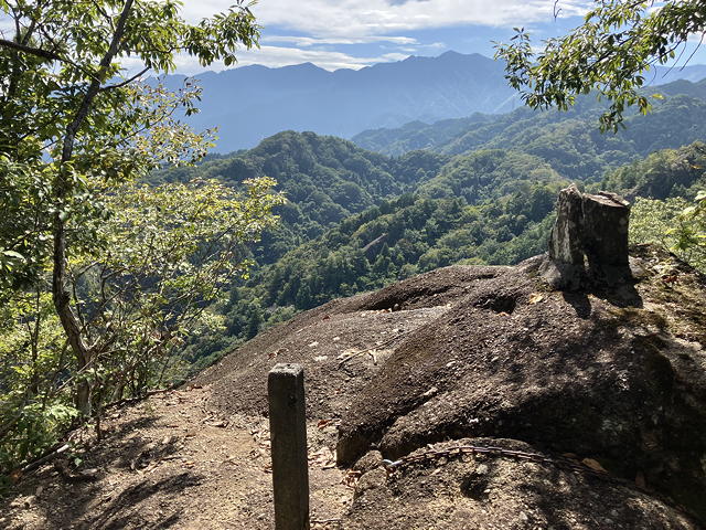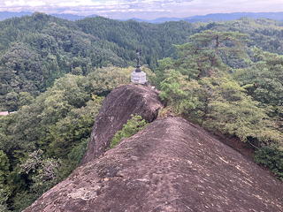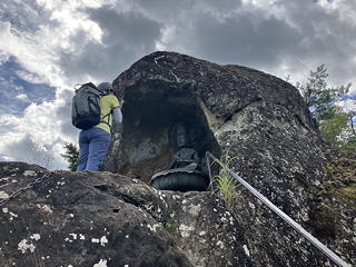 岩尾根の脇につけられた道を登ることしばし、前方の岩の突起に向けてステップが切られ鎖が付けられた場所に出ました。あれが大日如来のおわす場所に違いありません。
