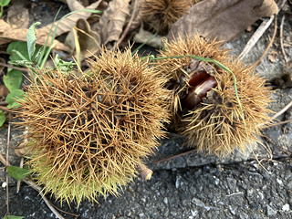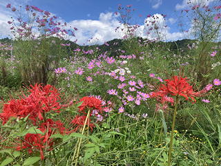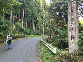 バス停から法性寺に向かう道はのどかな里の景色の中を通っており、道端の真っ赤なヒガンバナやピンクと白のコスモス、それに実って道に落ちている栗などがいかにも秋の風情です。さらに途中の「農産物直売所」では行動食としてイチジク4個入りパック(200円)を買い求めましたが、このように法性寺までの道中を気ままに歩けるのも公共交通機関を使うことのメリットです。