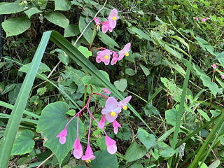 落合橋を渡って二俣を右に進むとあたりは森に囲まれるようになり、鉄工所のお遊びらしきガンダムや由緒ありげな神楽殿を備えた聖天社改め秩父大神社に挨拶をしながら歩き続けるとすぐに、法性寺の寺域に入りました。道の左側の斜面にはところどころに秋海棠がきれいな花をつけていましたが、そこに掲げられていた手書きの案内によれば秋海棠は鹿に食べられ、ほぼ全滅です。がっかりです